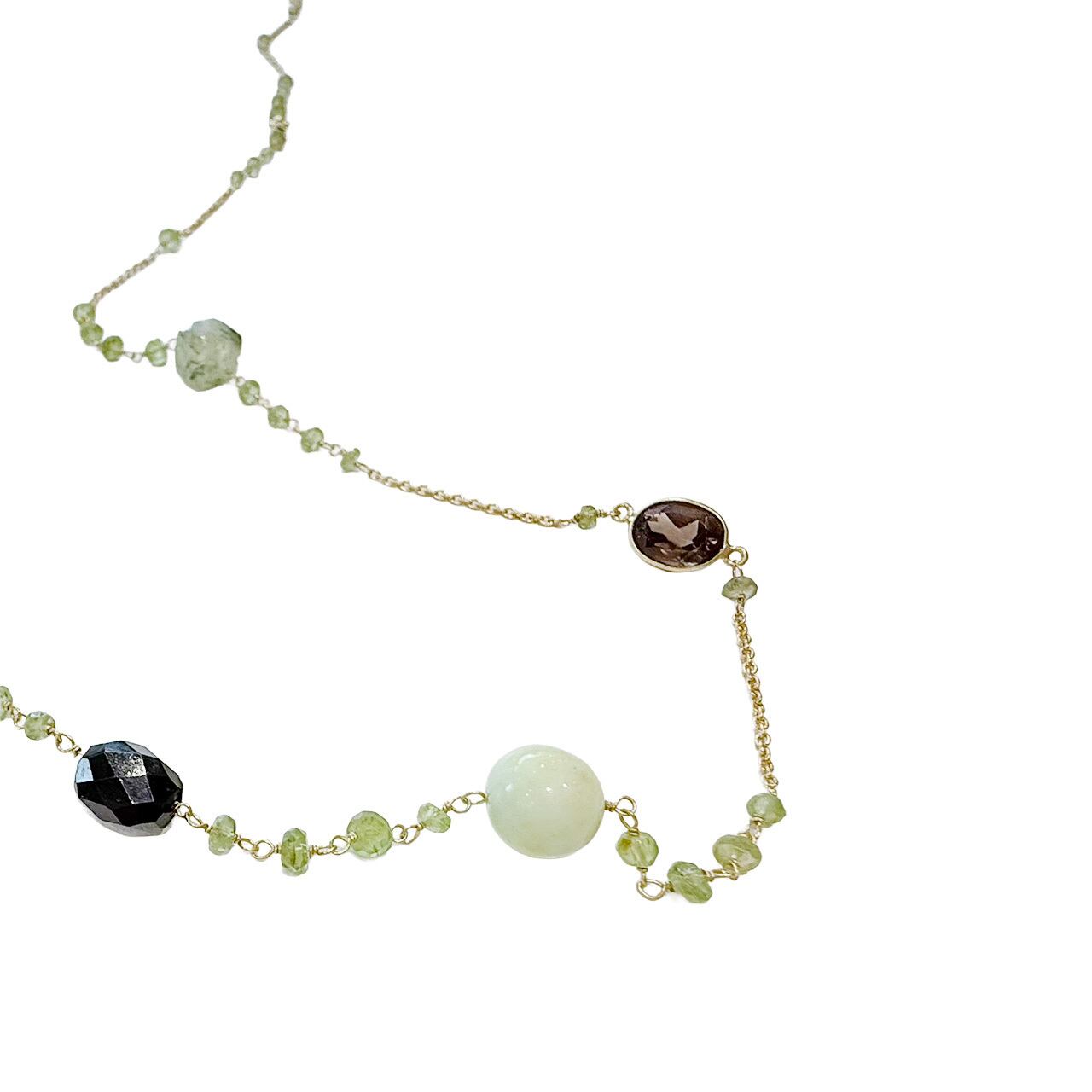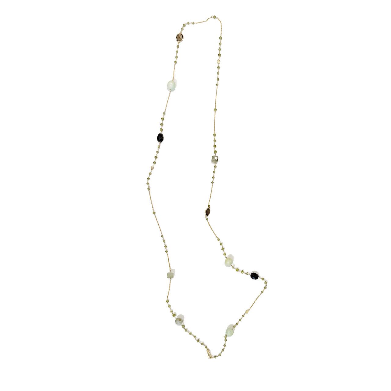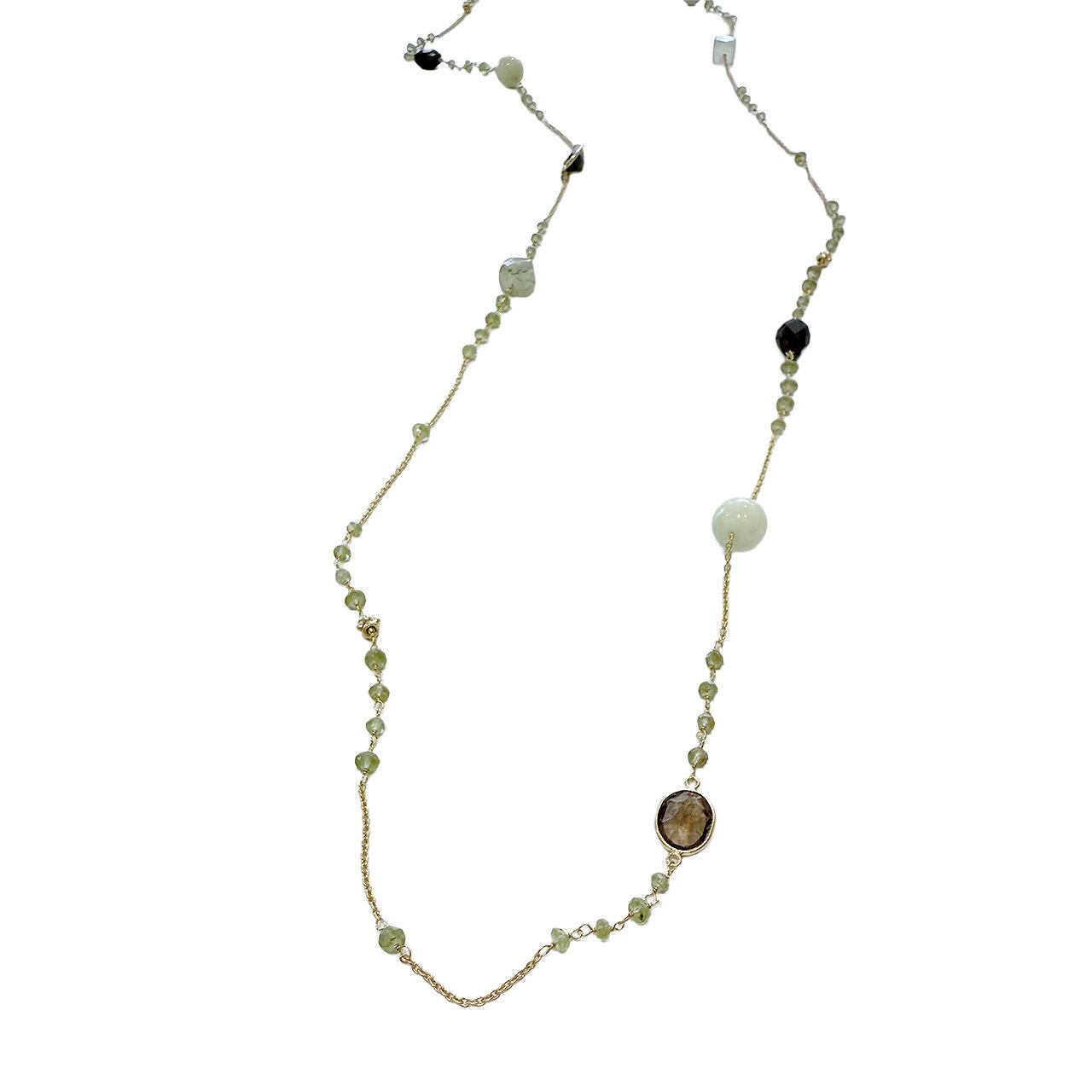 ランダムに選ばれた天然石のチャームを配置したロングネックレス。
