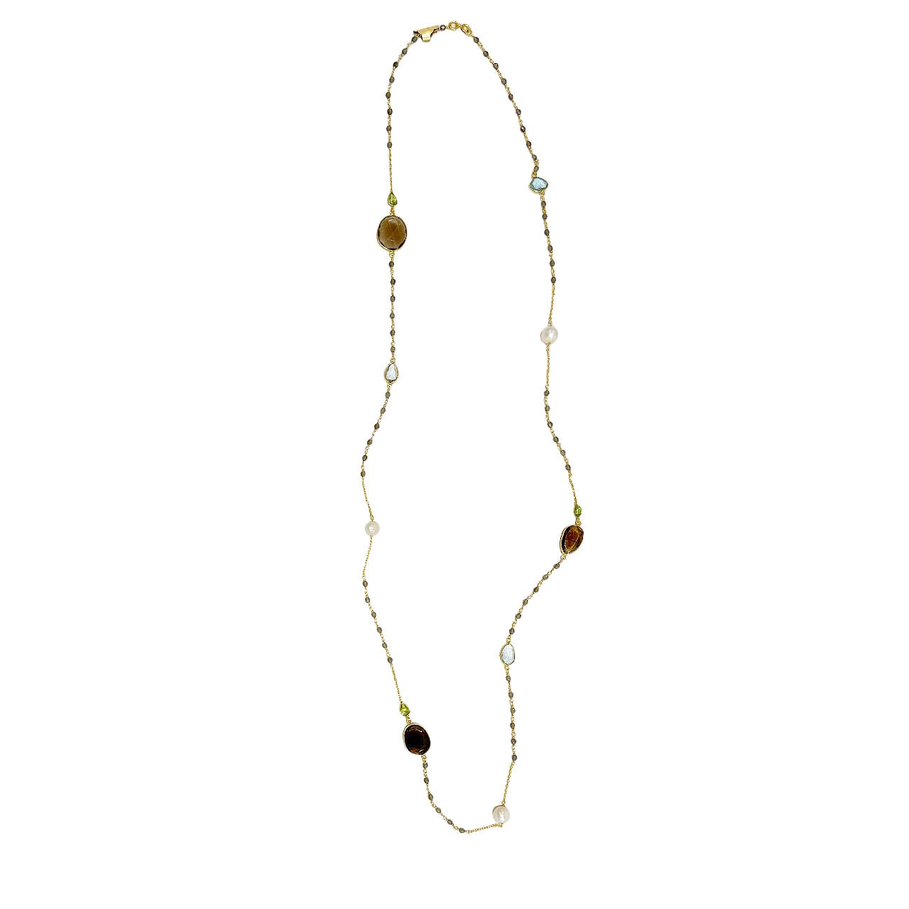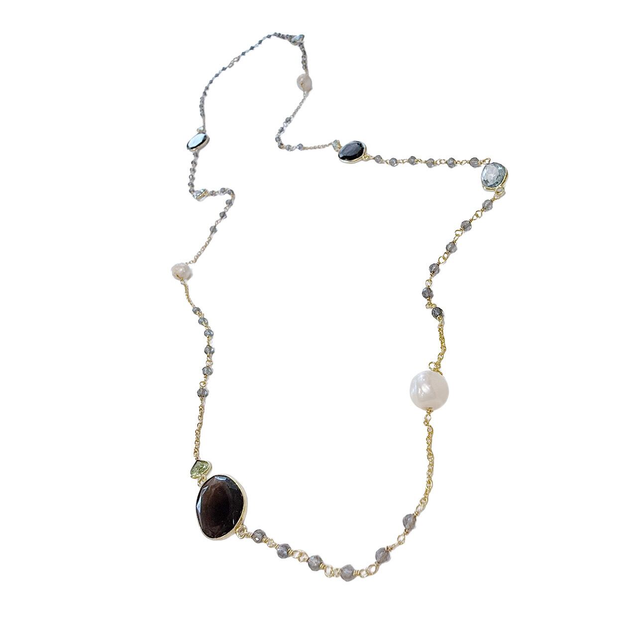 ランダムに選ばれた天然石のチャームを配置したロングネックレス。