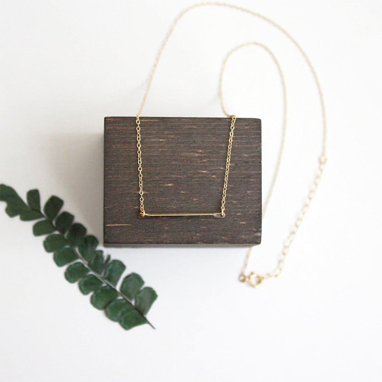 シンプル、モダン、そしてミニマル。14金張りのバーネックレスは、普段使いにぴったり。