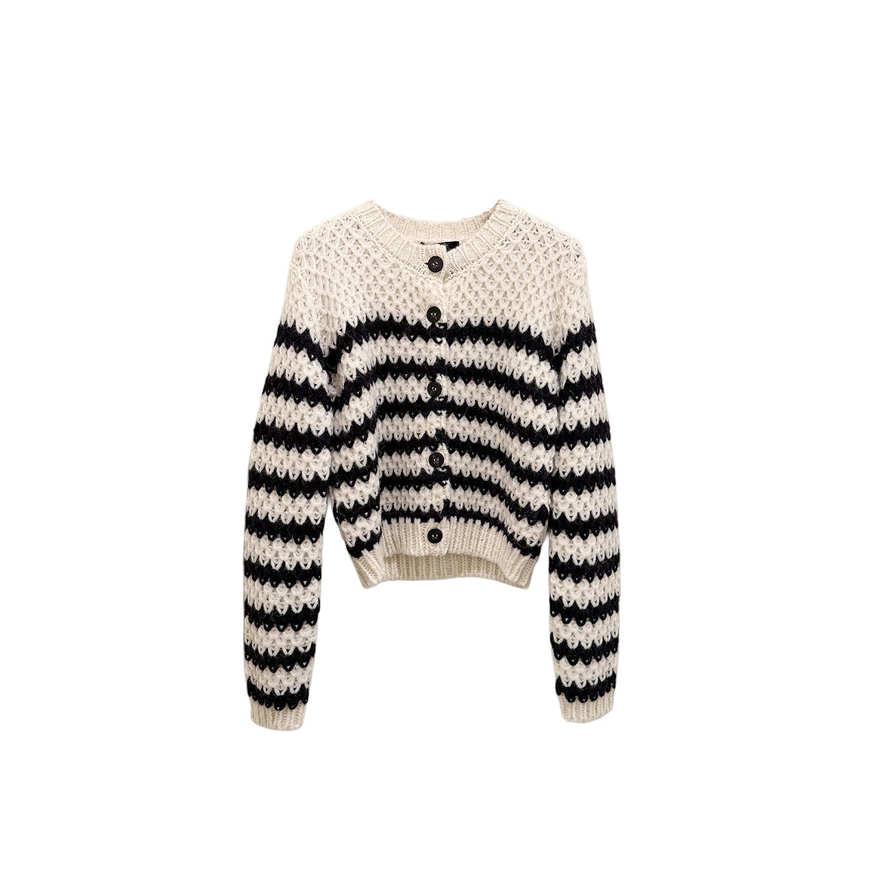アルパカとメリノウールをふんわり編み立てたカーディガン。