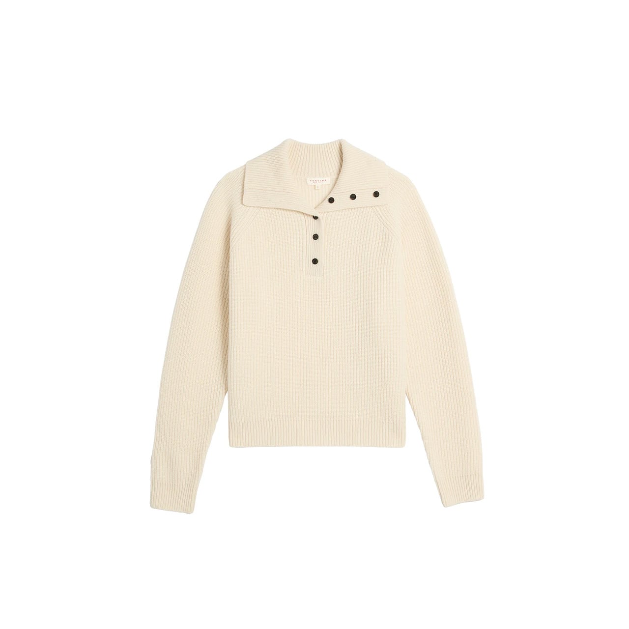 ボタンを止める位置で襟の形を変えられる、ふんわり軽くて暖かいウールセーター。