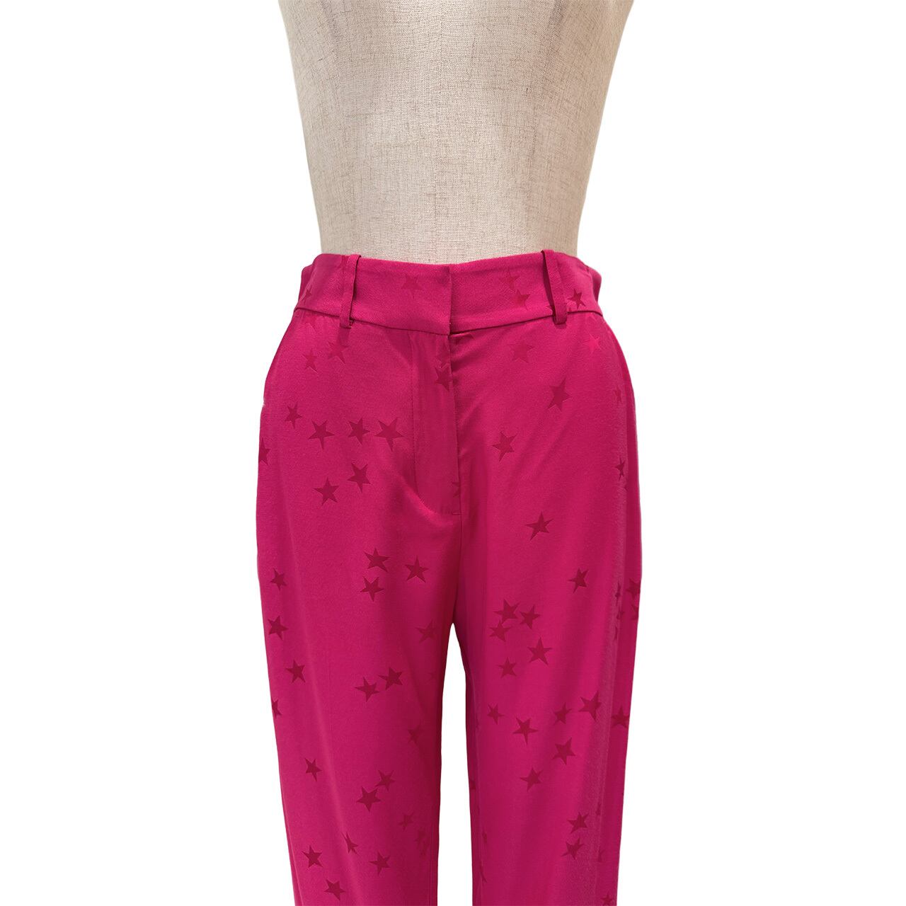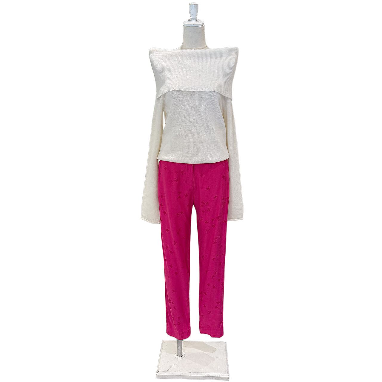 ランダムに配置された星柄が遊び心をくすぐるテーパード型パンツ。