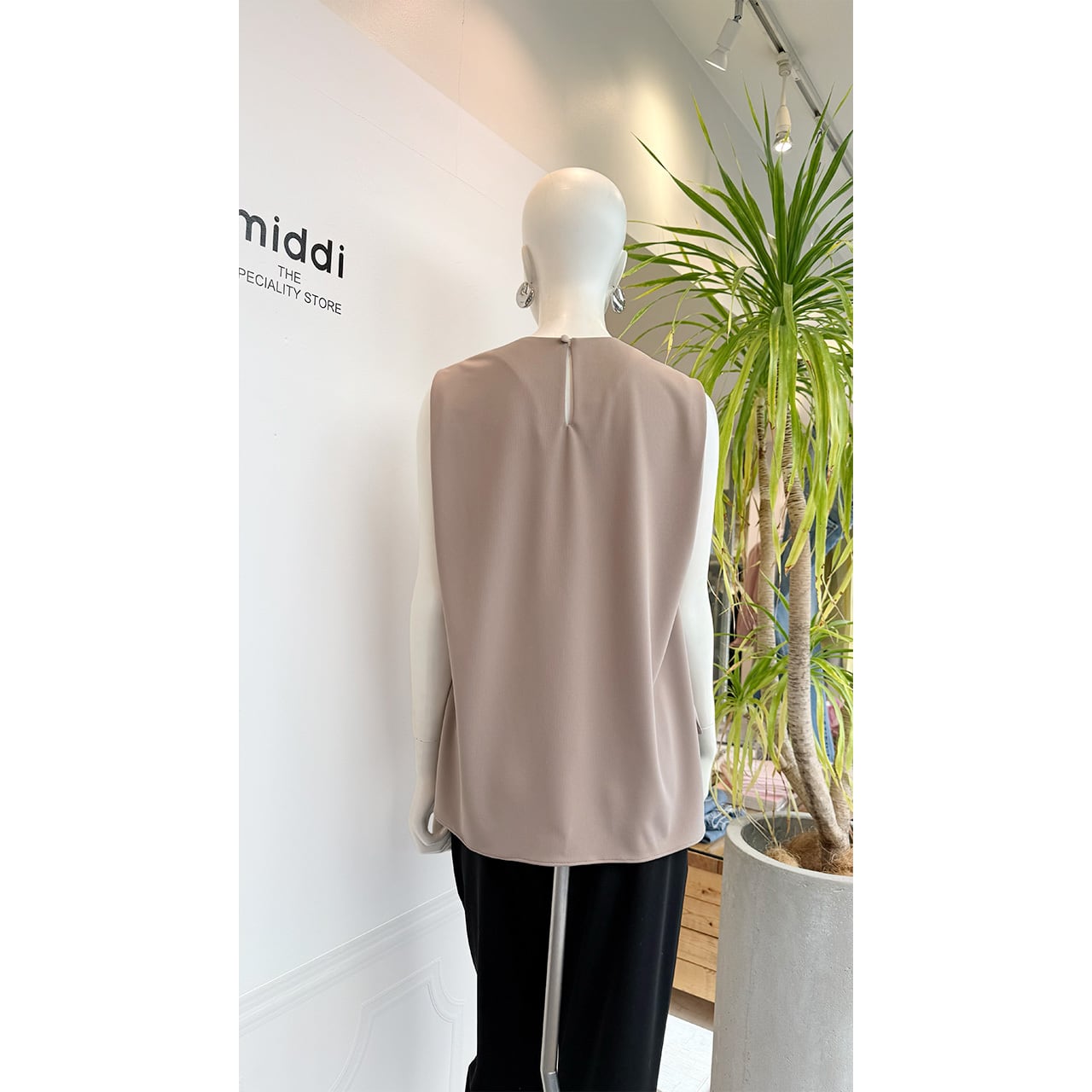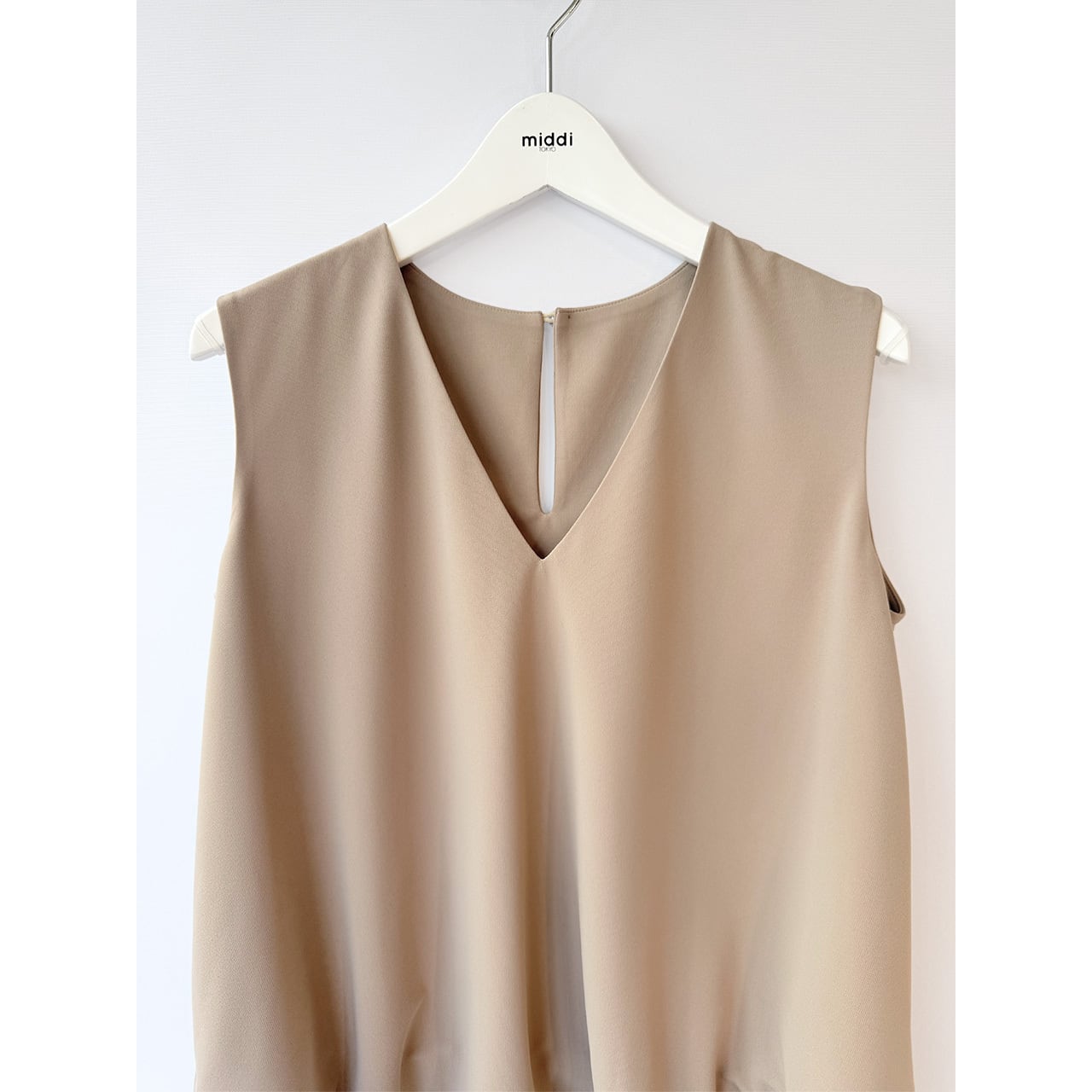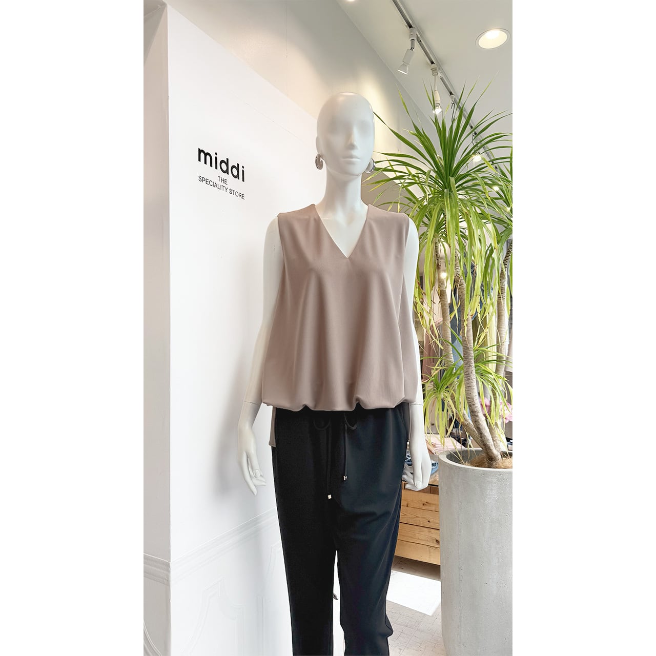 着心地がよくウォッシャブルで大人気のmiddiオリジナルジャージーシリーズより、ギャザー入りノースリーブトップスにVネックタイプが登場!