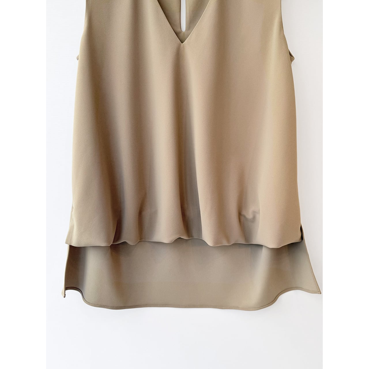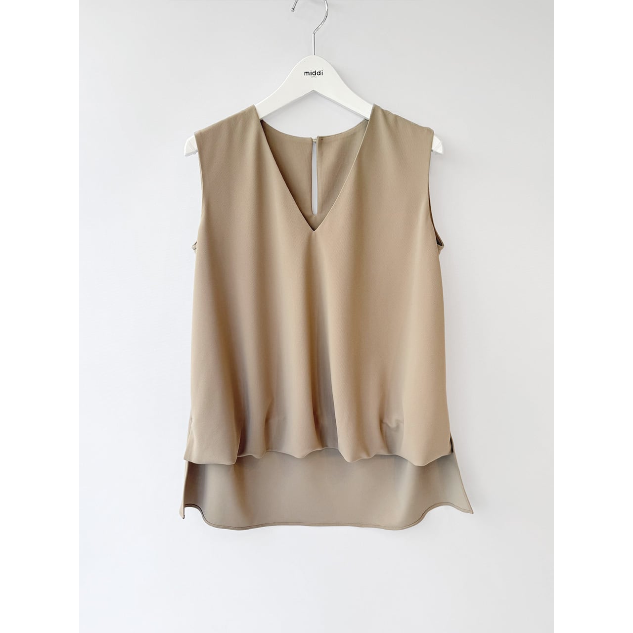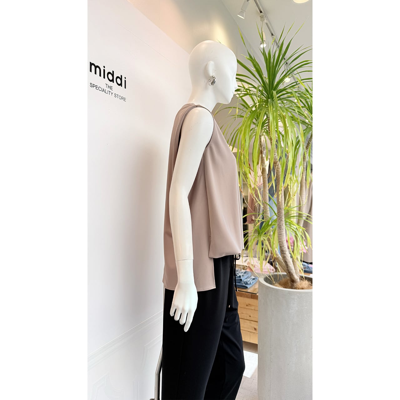 着心地がよくウォッシャブルで大人気のmiddiオリジナルジャージーシリーズより、ギャザー入りノースリーブトップスにVネックタイプが登場!