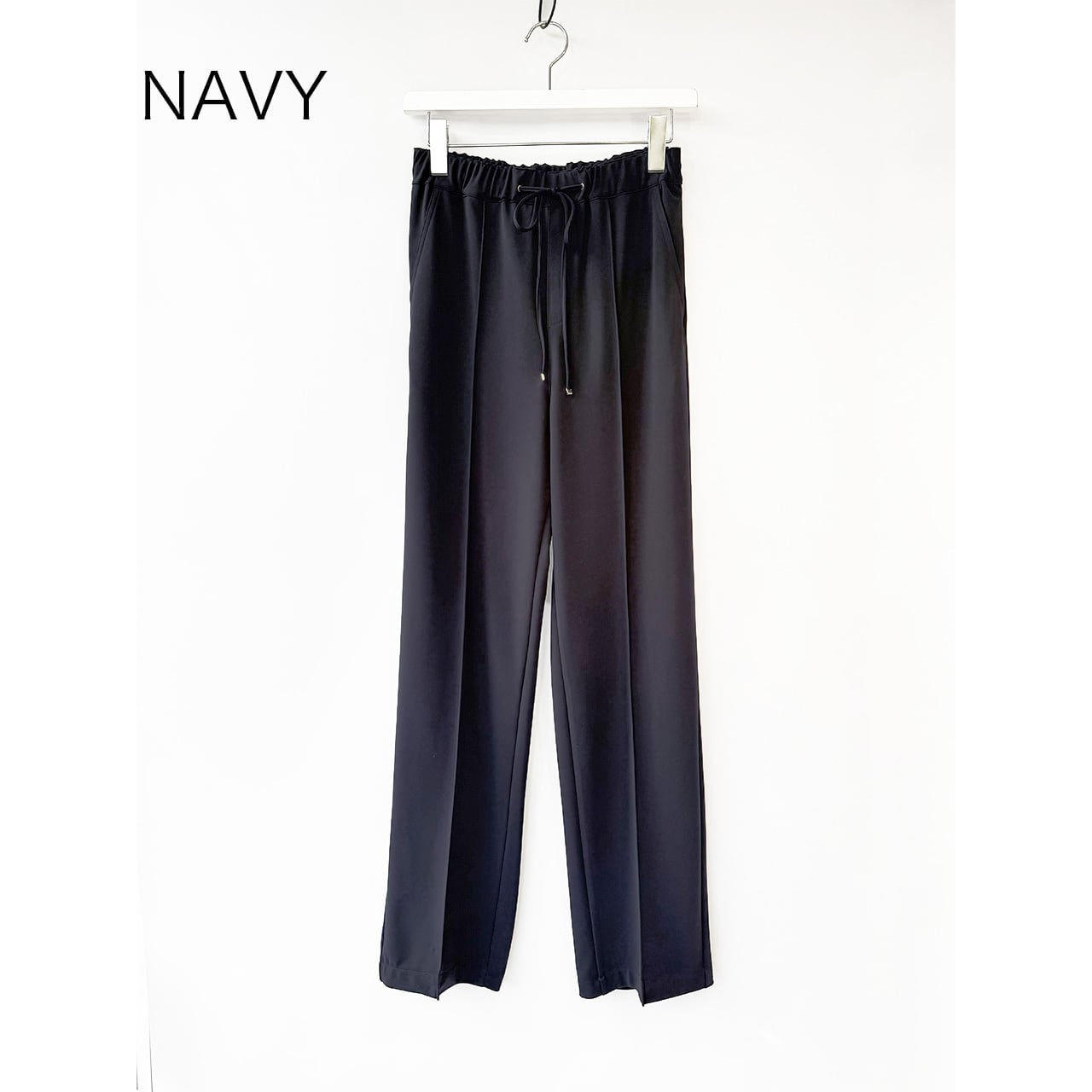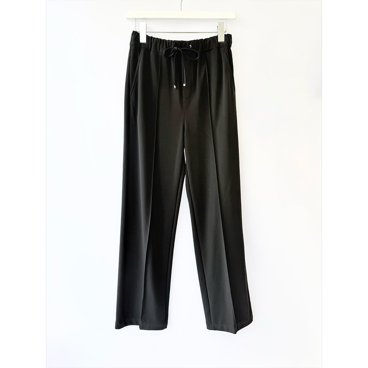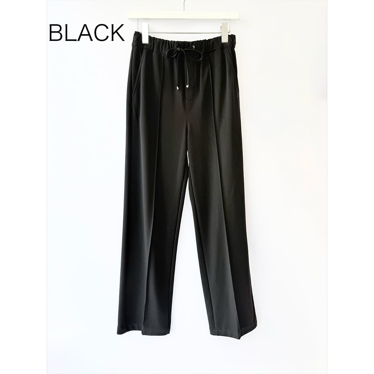 着心地のよいジャージー素材が人気の生地を使用した、センターライン入りストレート型パンツ。