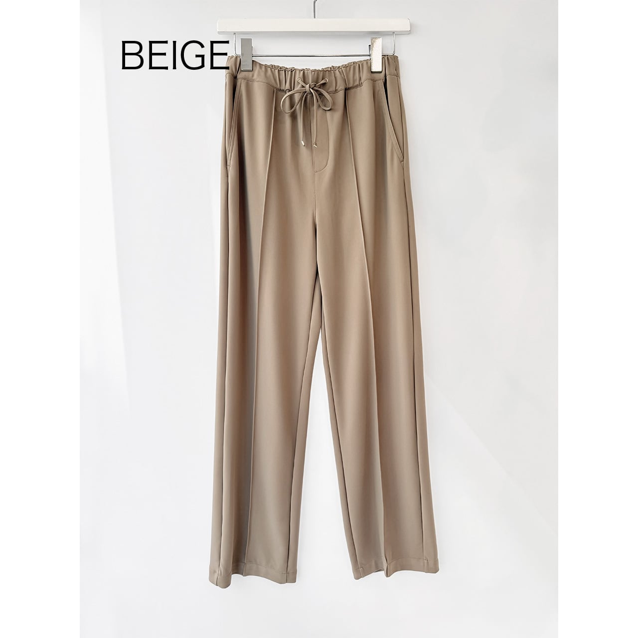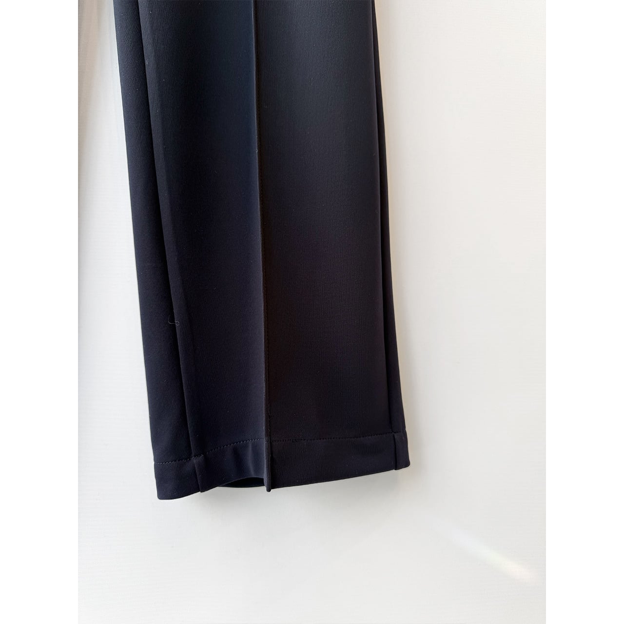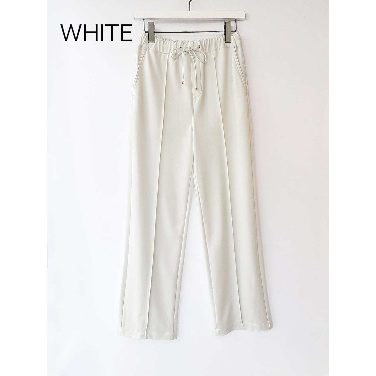 着心地のよいジャージー素材が人気の生地を使用した、センターライン入りストレート型パンツ。