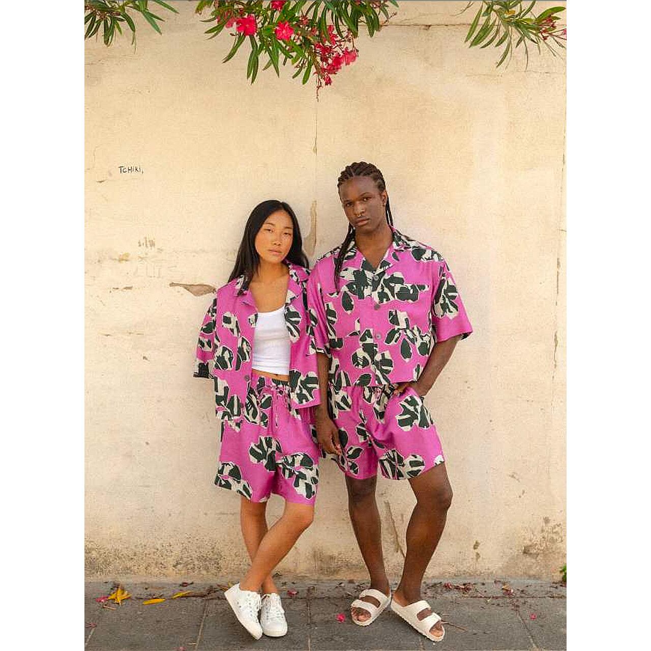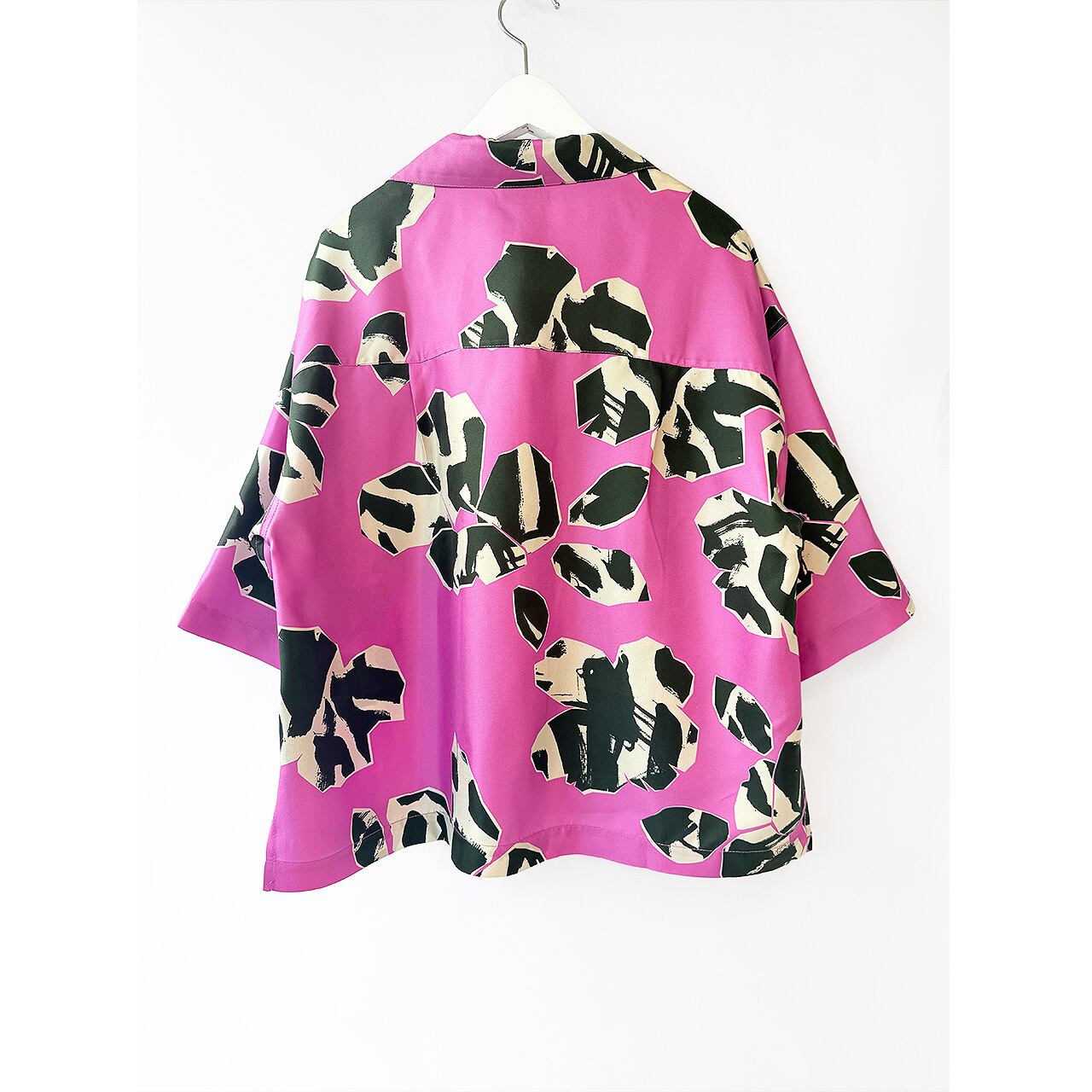 グラフィカルな柄を大胆にデザインした、クロップド丈のオーバーサイズシャツ。