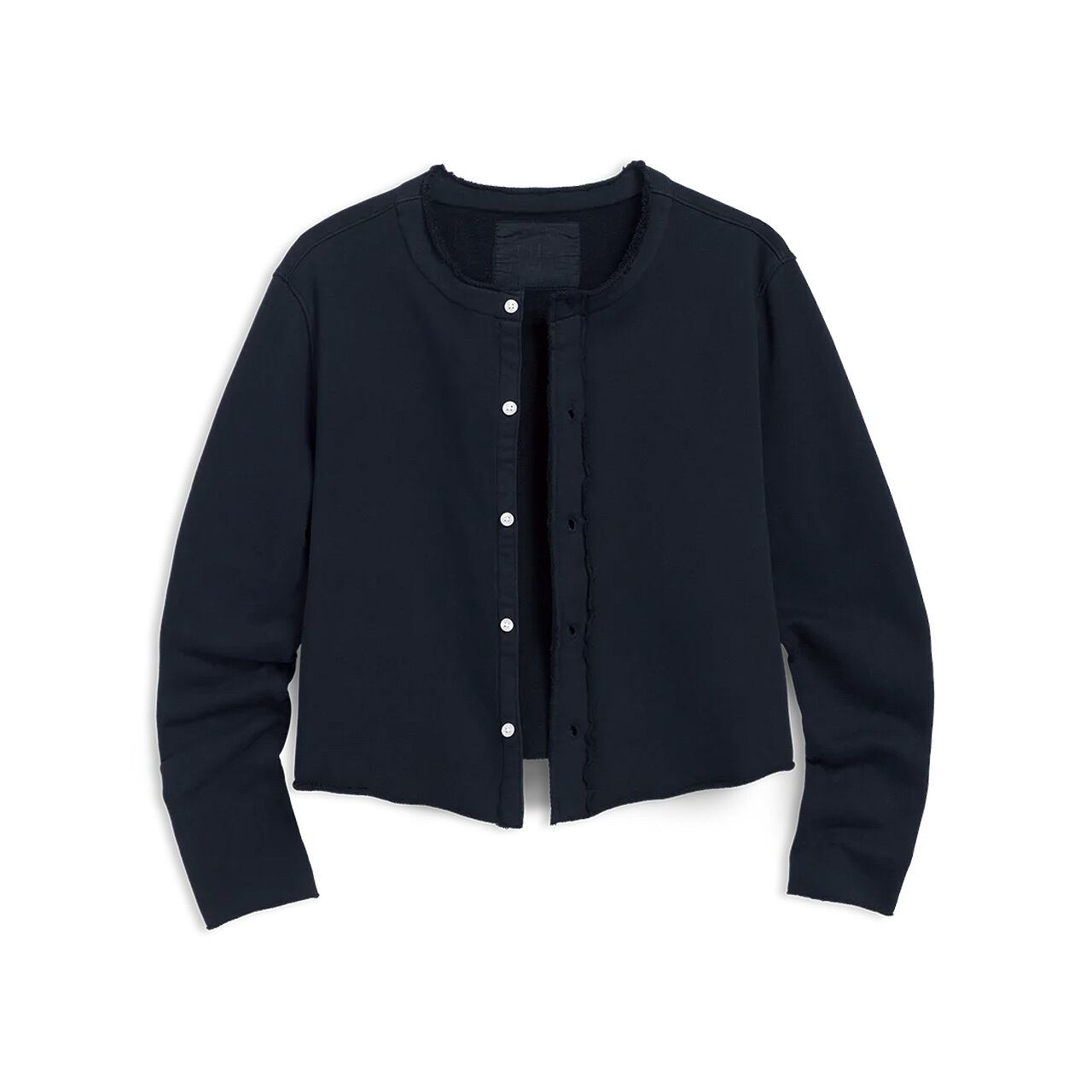身幅はゆとりを持たせつつクロップド丈でスタイルアップ効果が叶う、スウェット生地のカーディガン。襟ぐりや裾を切りっぱなし加工にすることで、大人のリラクシースタイルをプラス。