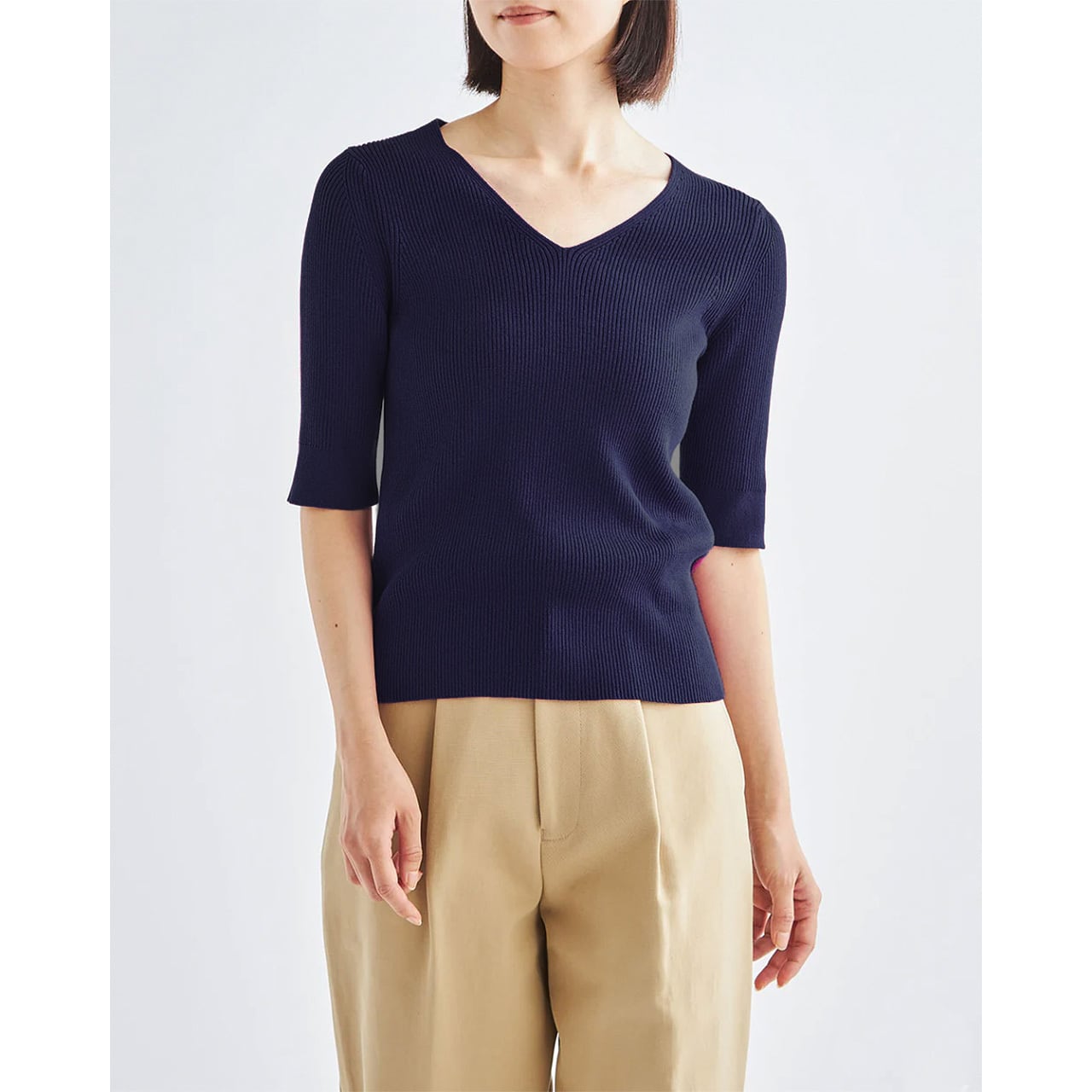 14ゲージ天竺編みを*フルファッションで丁寧に編み立てた 5分袖Vネック。