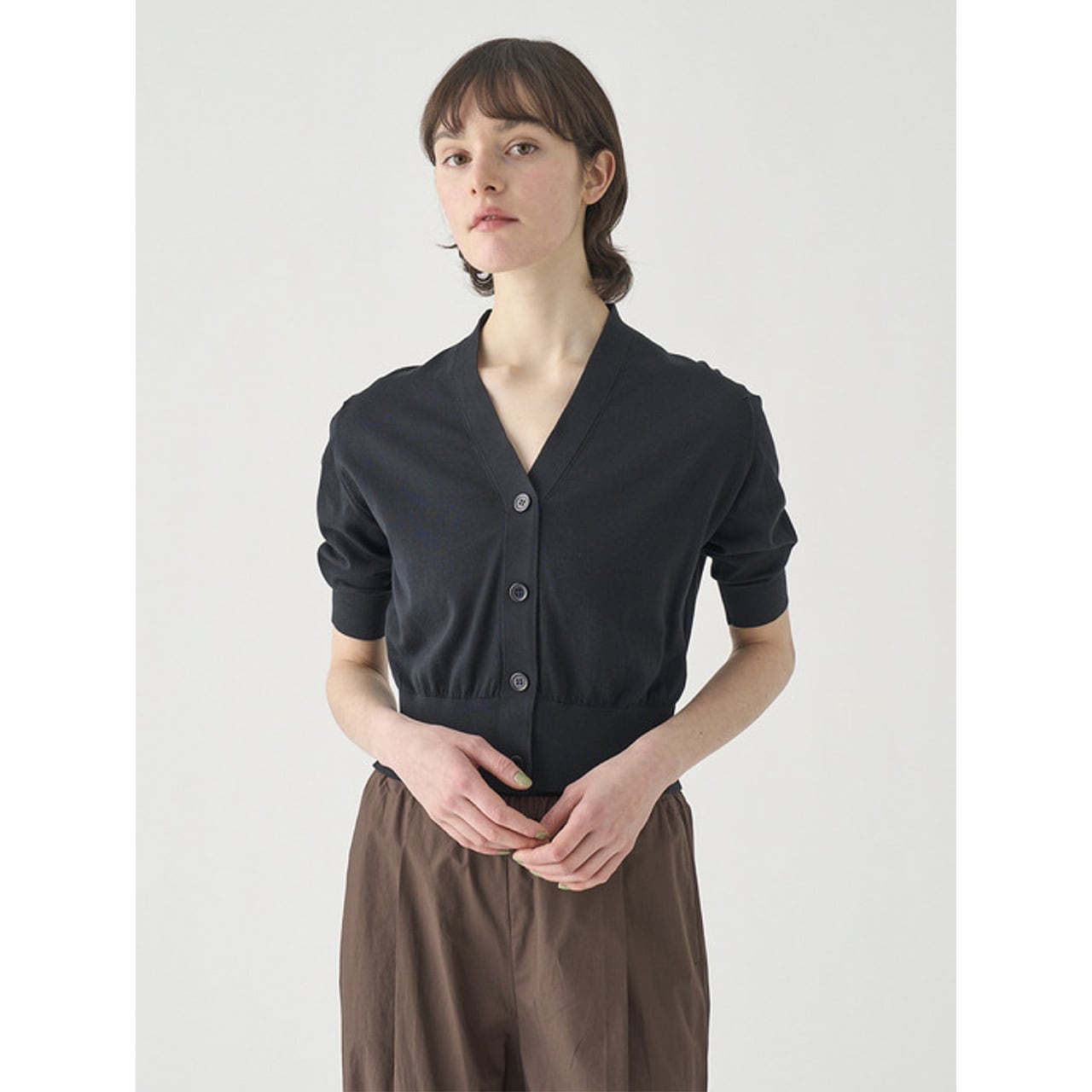 肘まで隠れる5分袖とすっきりとした短めの着丈が印象的なカーディガン。
