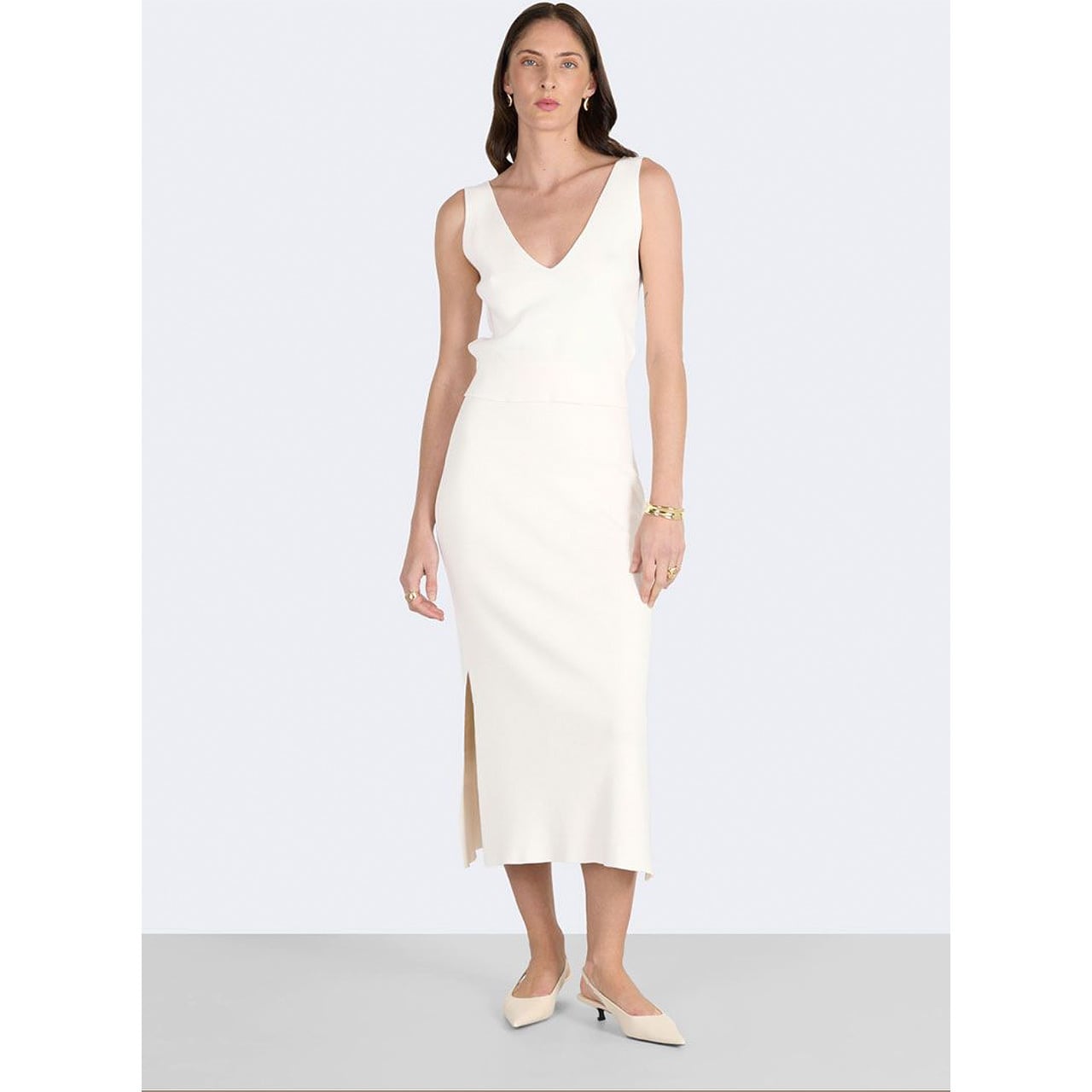 ごく細かなリブ編みが生地に厚みをもたせ、ボディラインを拾いすぎないすっきりとしたシルエットに。