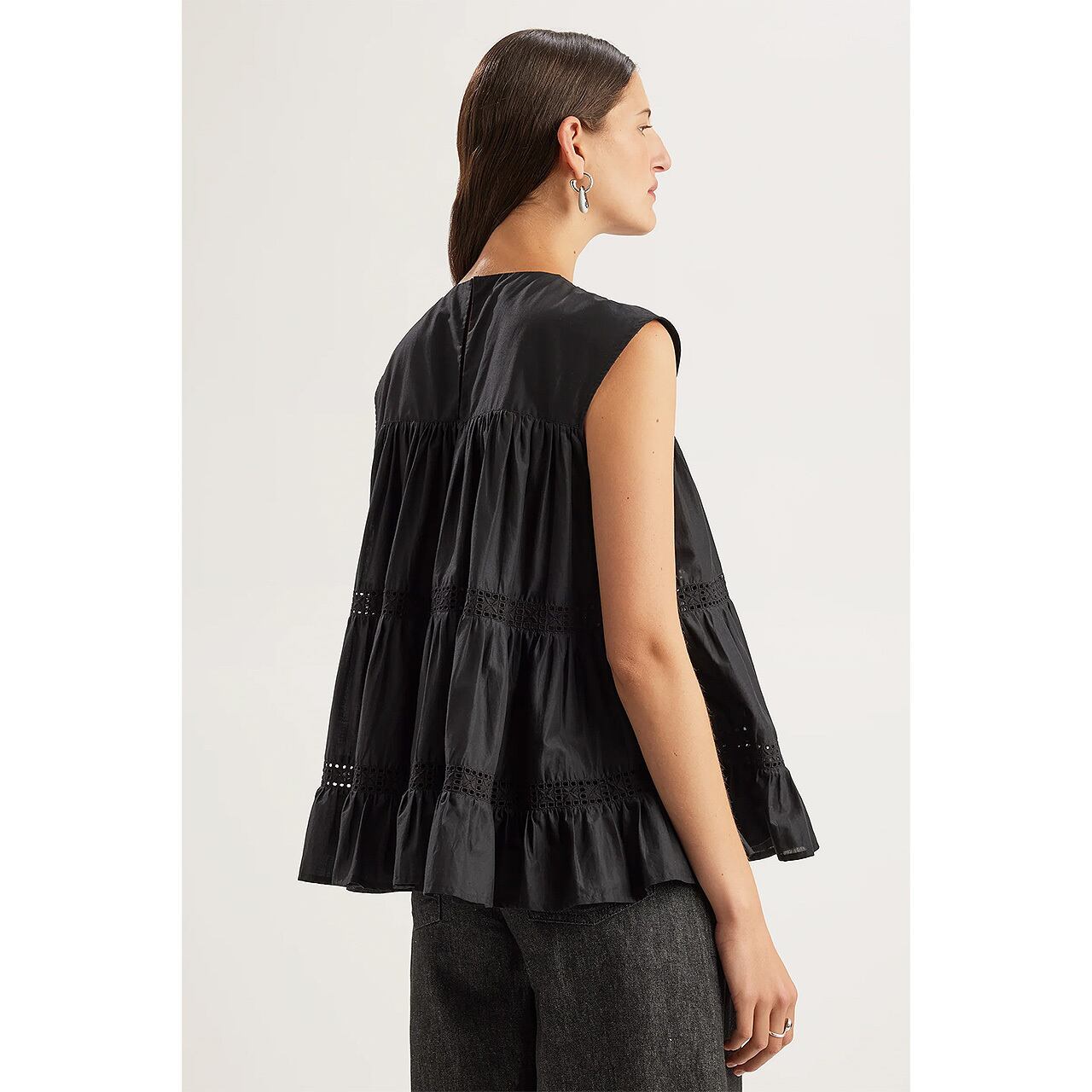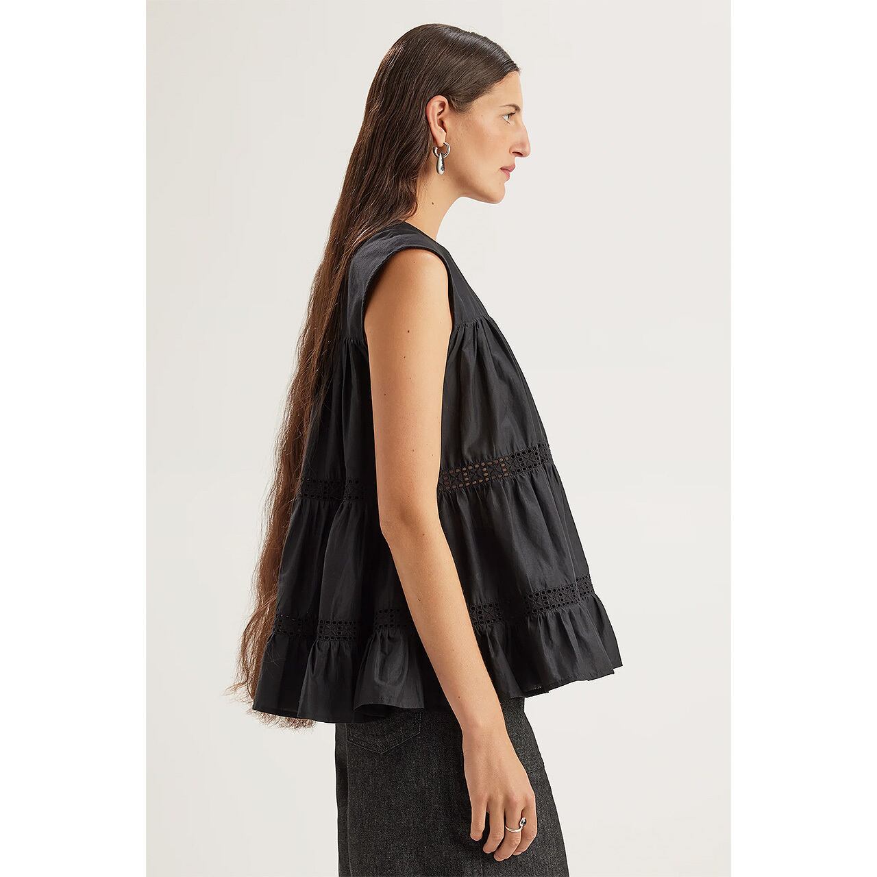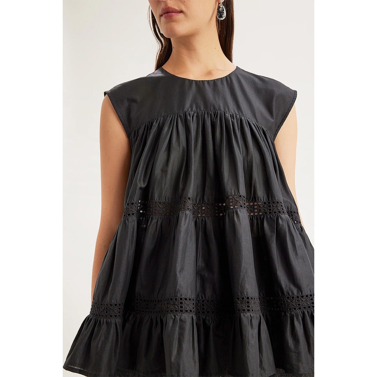 軽やかなピマコットンローンで仕立てたティアードが、構築的でありながらリラックス感のあるシルエットを描きます。