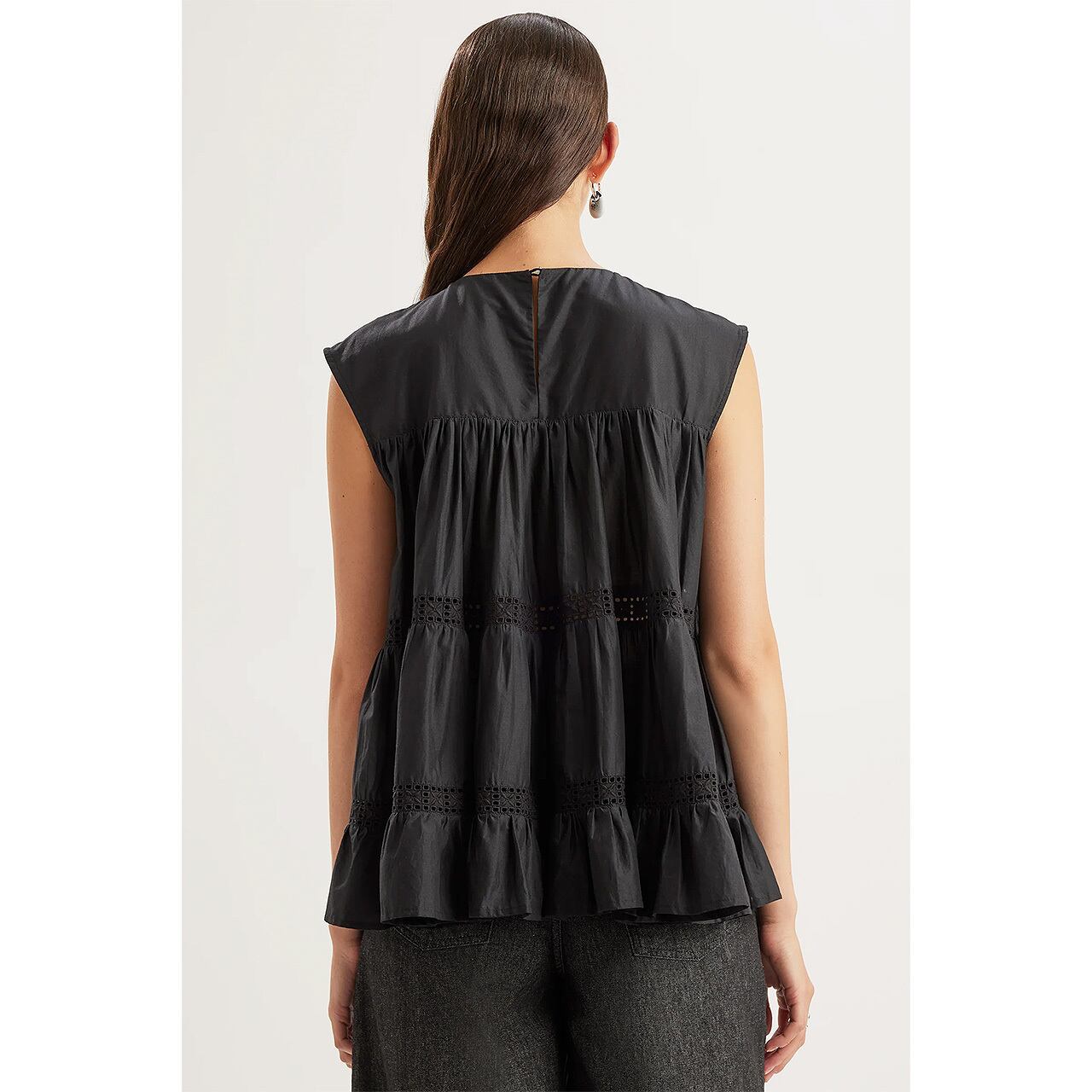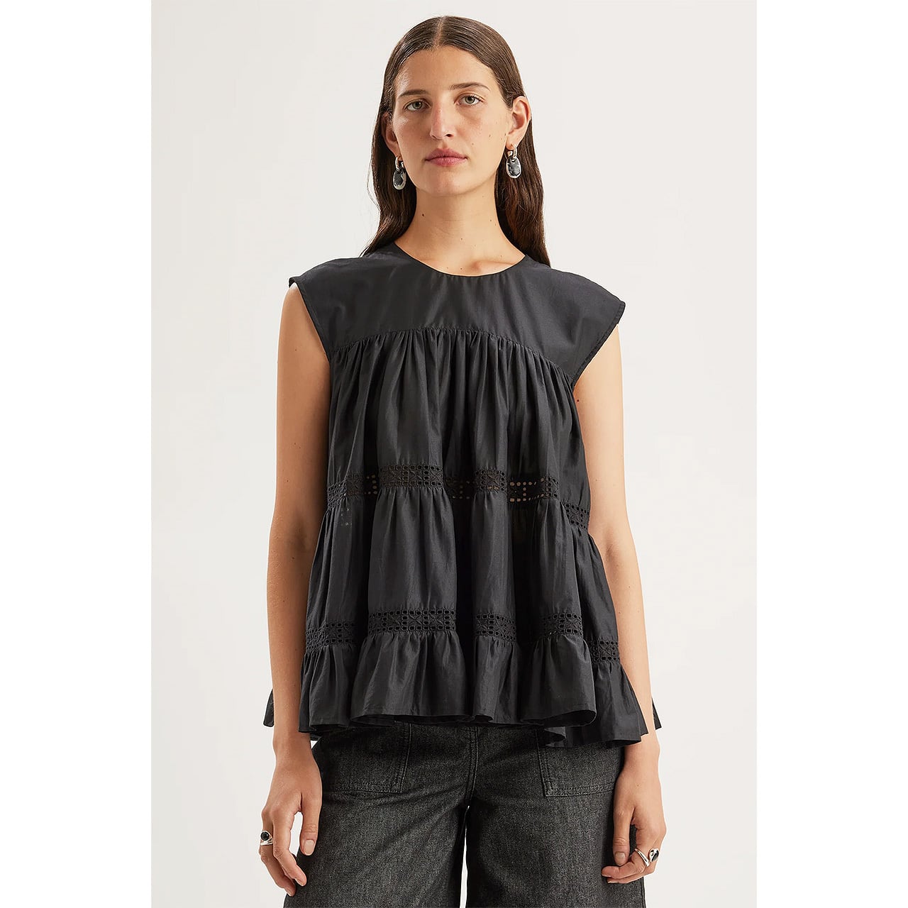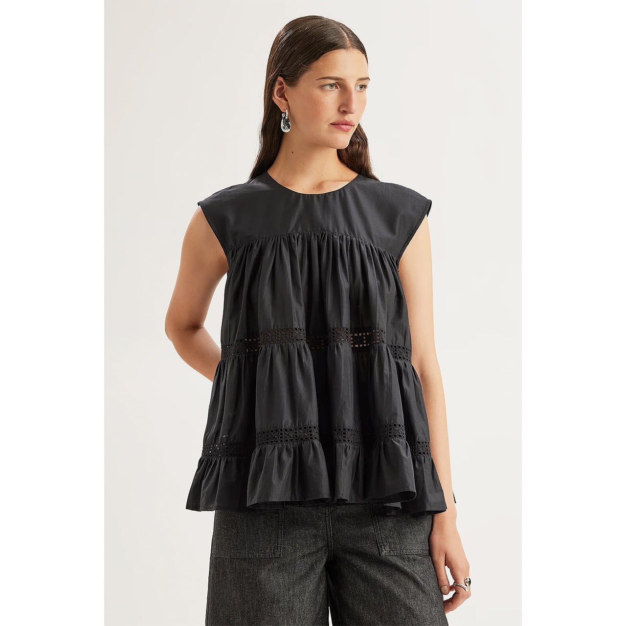 軽やかなピマコットンローンで仕立てたティアードが、構築的でありながらリラックス感のあるシルエットを描きます。