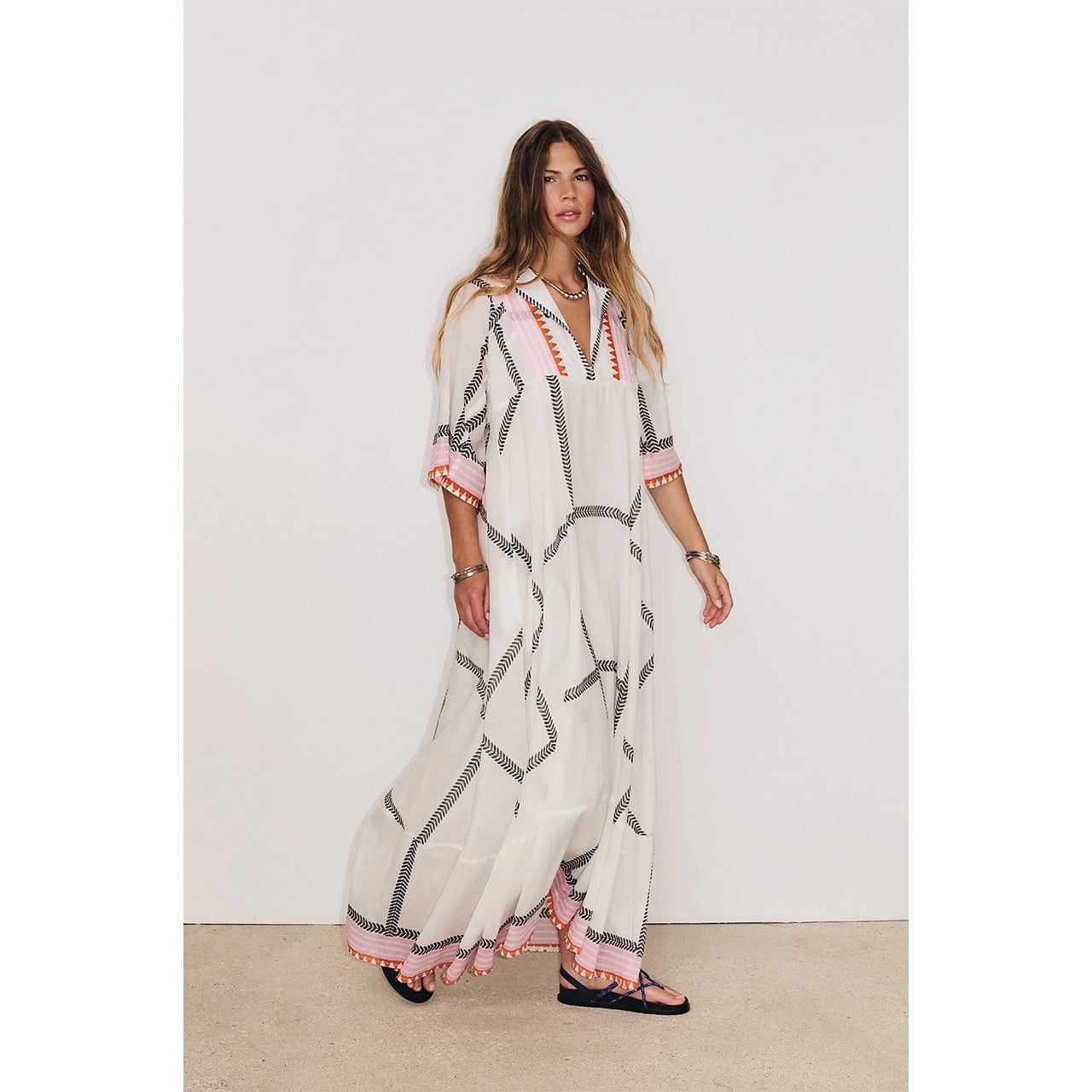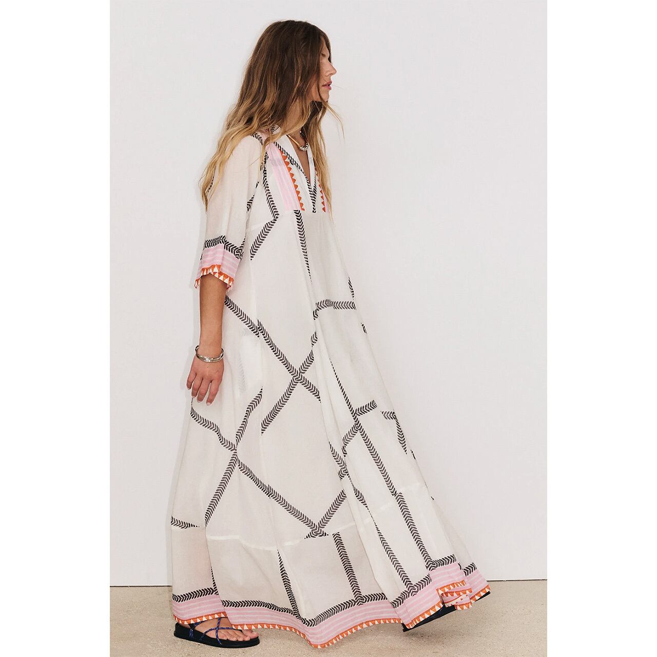 シルエットを美しく見せるカッティングが特徴のカフタン風マキシ丈ドレス。