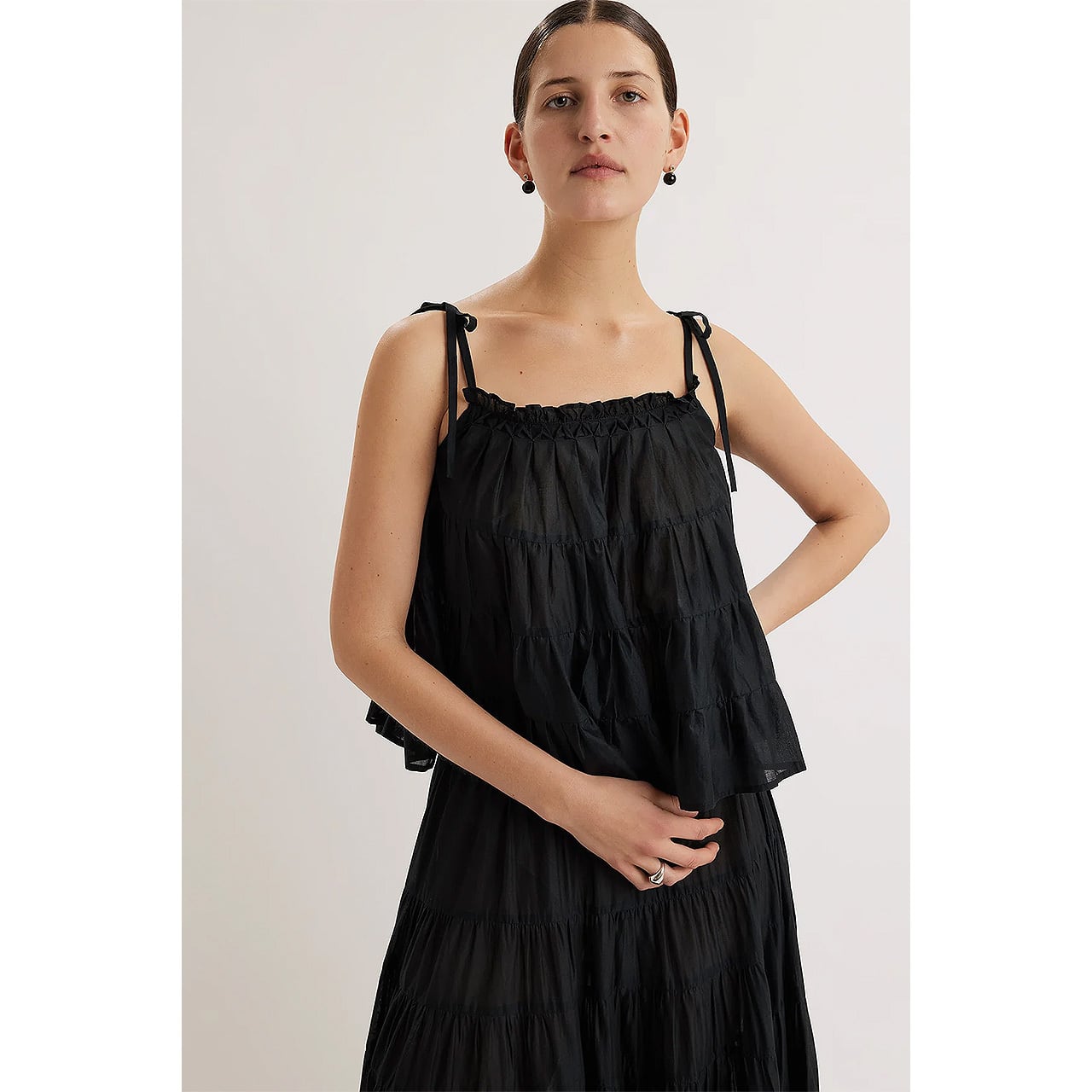 グラデーションのように流れるティアードが光と風を受けて優雅に揺れ、クロップドシルエットがモダンなバランスを描きます。