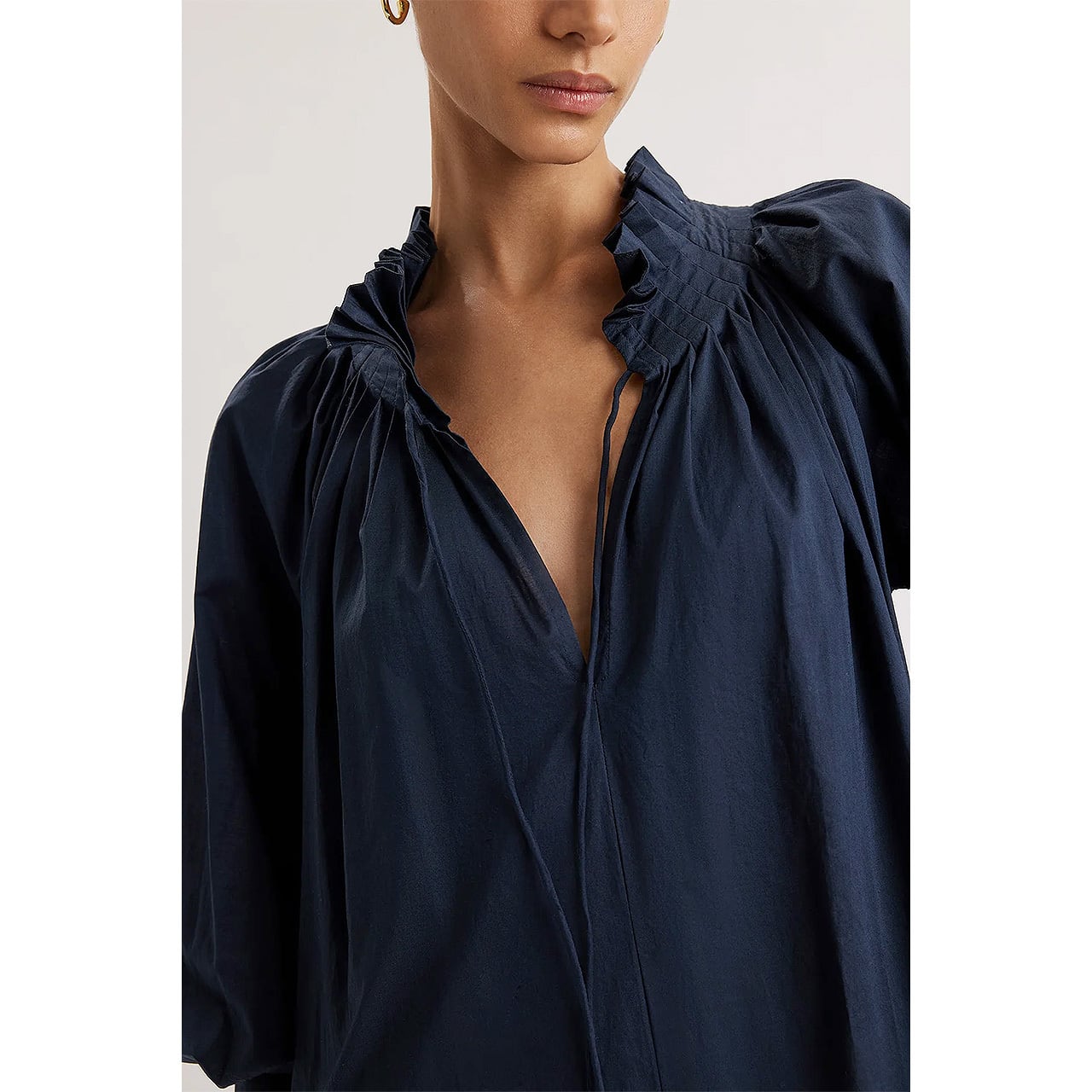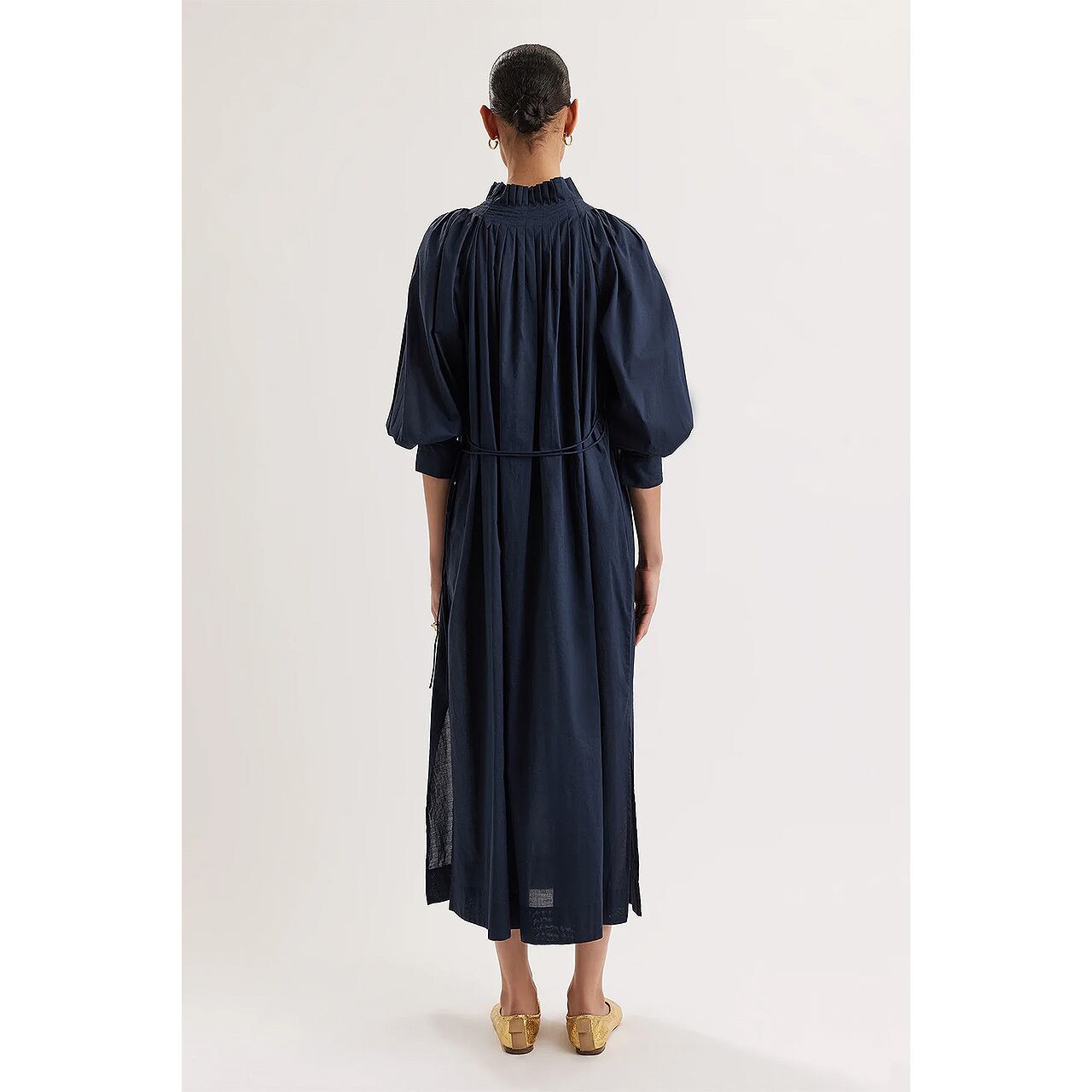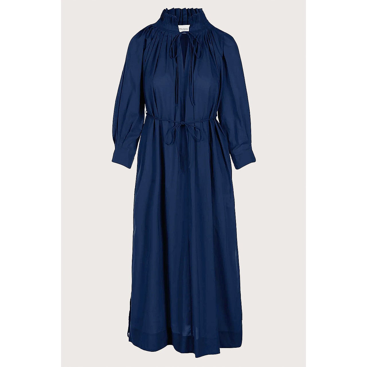 柔らかなピマコットンローンで仕立てたティーレングスのシルエットに、繊細なプリーツを施したネックライン、ロマンチックなセルフタイが優美なアクセントを添えます。