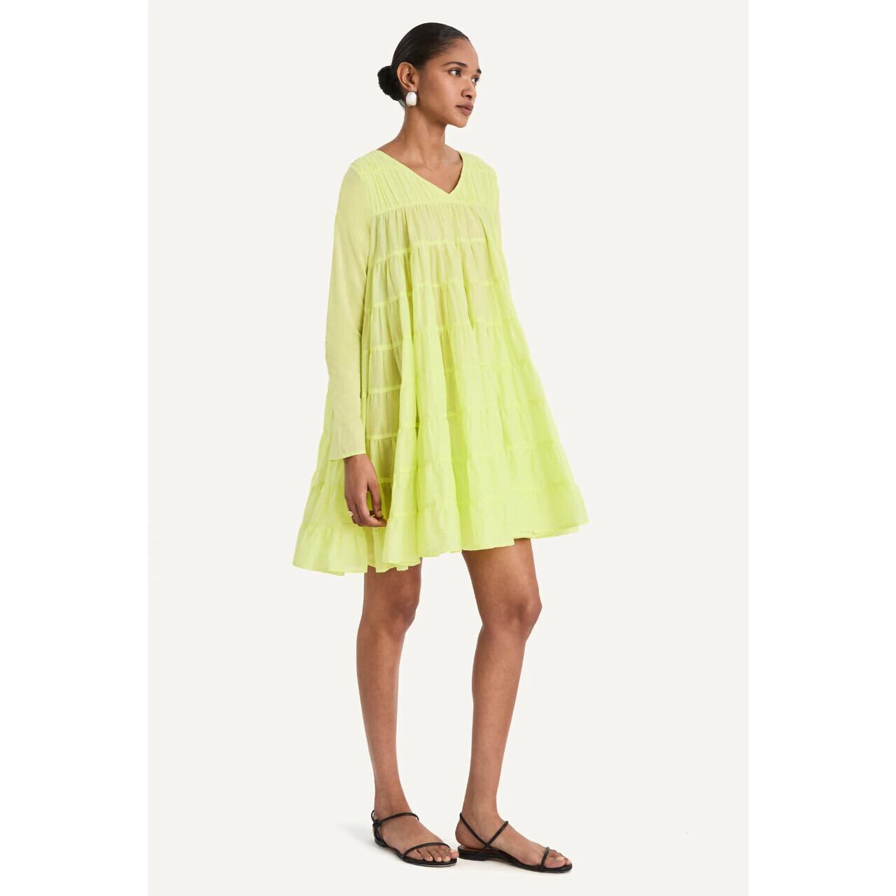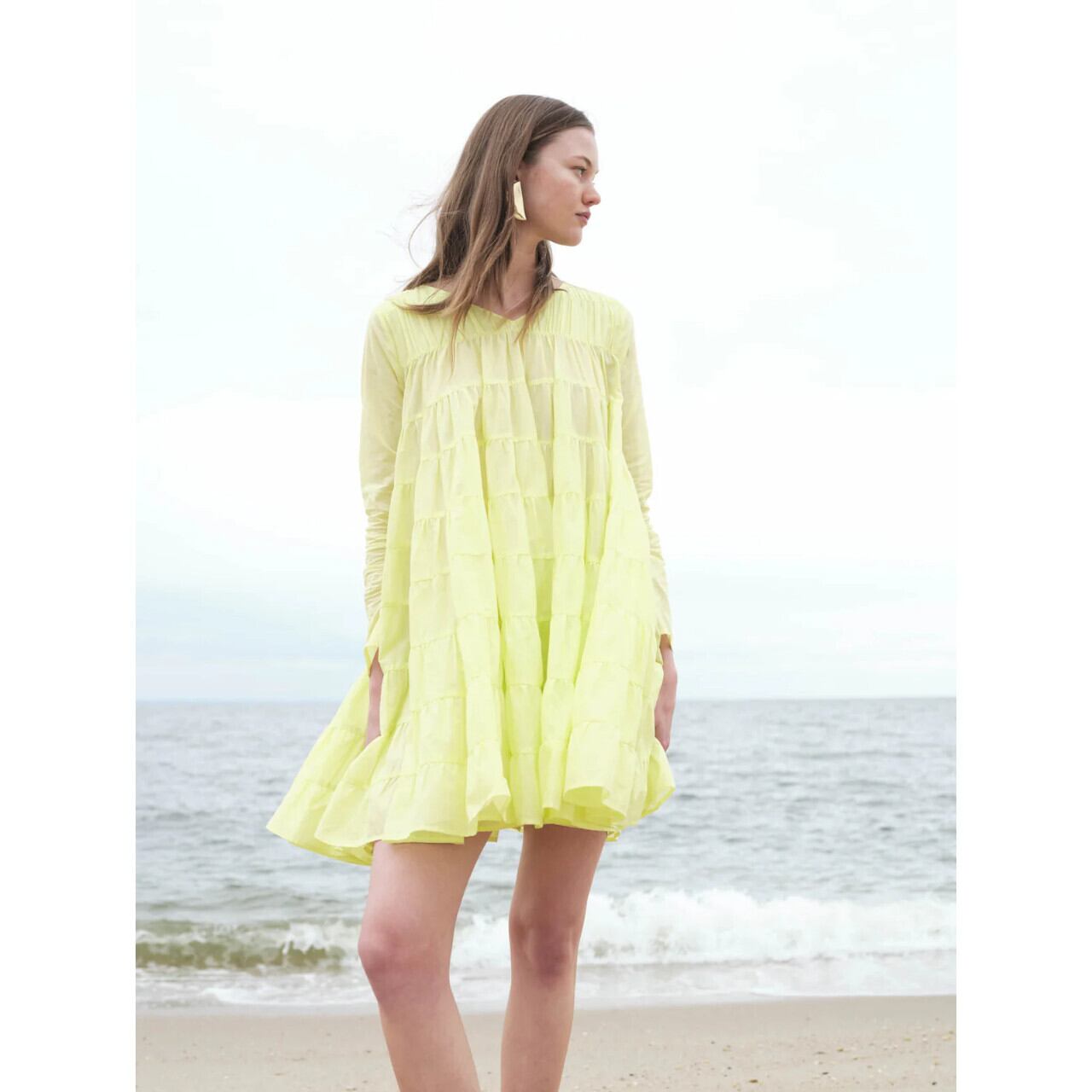 たっぷりのティアードにスモッキング刺繍を施した贅沢なデザインで、柔らかなレモンイエローがフェミニンな雰囲気を演出。