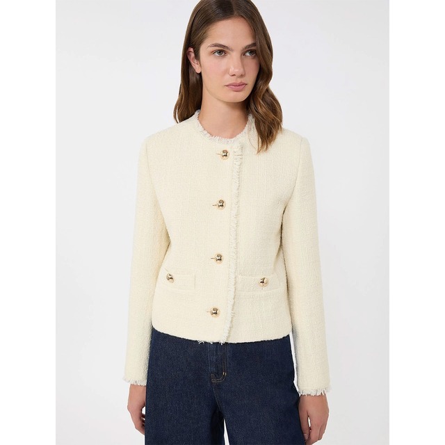 ヴァージンウールブレンドのノーカラージャケット。 パンツにもスカートにも合わせやすい着丈で、コーディネートの幅が広がります。 サイズ:40 バスト 約94cm 着丈 約51.5cm 肩幅 約39cm 袖丈 約61cm カラー:OFF WHITE 素材: (表地) ウール93% ポリエステル7% (裏地) アセテート50% レーヨン50% (そで裏地) アセテート65% ナイロン31% ポリウレタン4% 洗濯:クリーニング