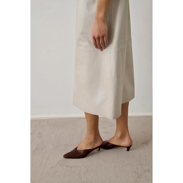 V型のカットが素足を綺麗に見せてくれるローヒールミュール。 履き口のカッティングが深いのでミュールでも脱げにくく、滑らかなレザーが足にフィットします。 *ATTENTION ・天然素材の商品の場合、ハンドメイドによる生産過程で生じる多少のキズやシワがある場合がございます。予めご了承下さいませ。 ・素材の特性上、多少の色ムラや擦れが見られる場合がございますが、着用には問題ございません。 ・インポート商品の為、輸送の際に多少箱が破損している場合がございますが商品に影響はございません。 *サイズ表記はあくまでも標準の目安となっております。 足の形による適正サイズの個人差がございますので、あらかじめご了承ください。 サイズ: 37/約23~23.5cm 38/約24~24.5cm *ヒール高さ:約4.5cm カラー:BROWN 素材:カウレザー ポルトガル製